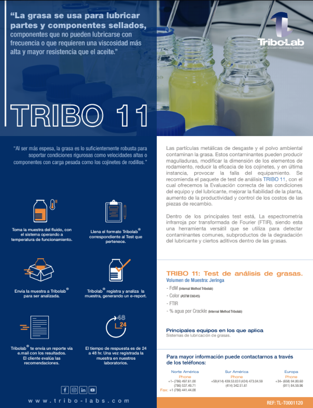 El análisis de lubricantes, grasas y refrigerantes, es hoy en día un factor primordial para el rendimiento óptimo de las máquinas, por lo que es necesario supervisar y controlar los fluidos. Esto permite aumentar el ritmo de la producción y mejorar la confiabilidad del proceso de manufactura en la industria, incrementa los beneficios y la rentabilidad de su empresa. En laboratorios Tribo-Lab ™, le ayudaremos a identificar cual es el test idóneo para sus equipos, y le emitimos reportes con recomendaciones y soluciones, para la mejora del proceso.